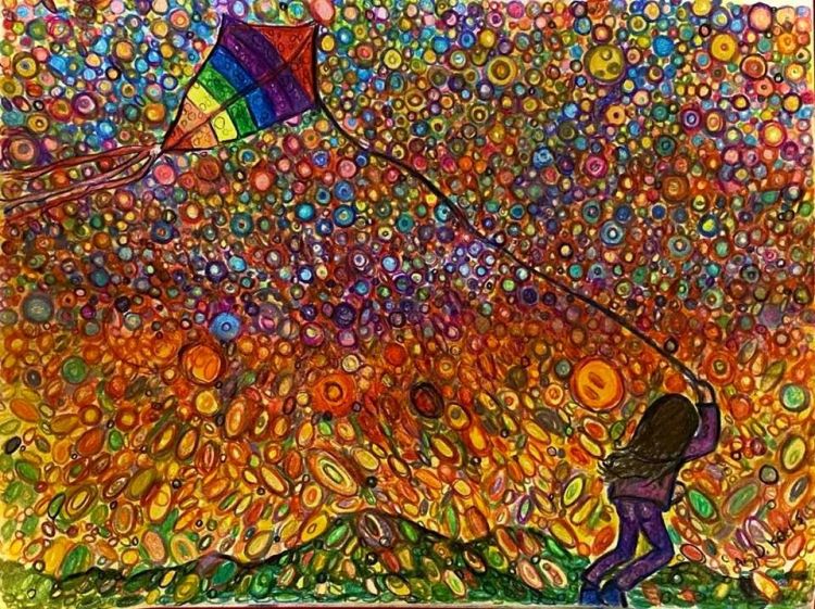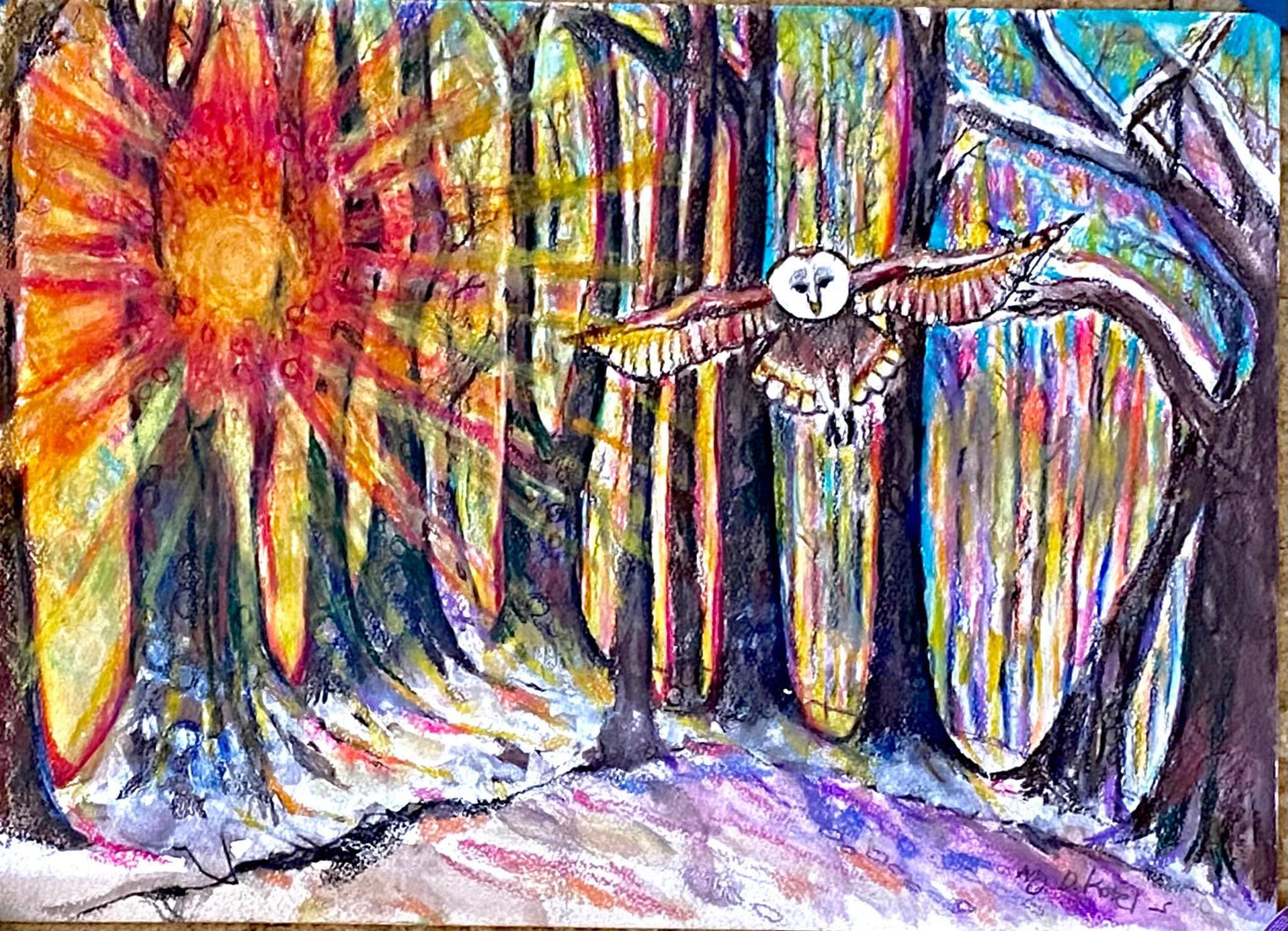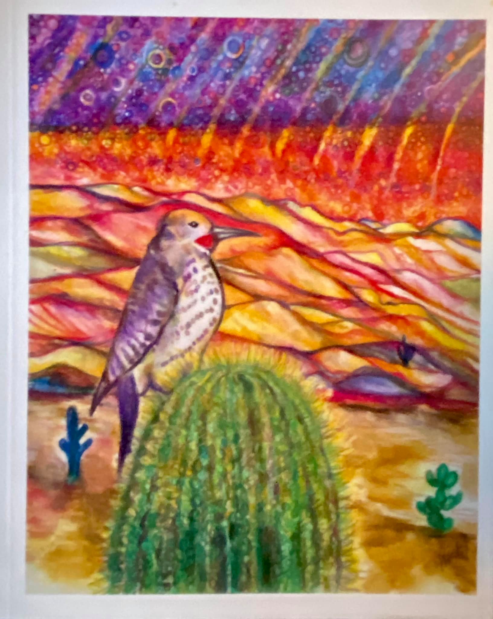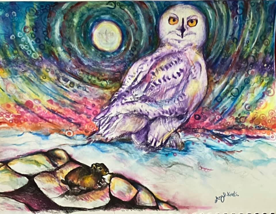 Below: Desert Bird, 11×14, Color Pencil, Watercolor Pencil, $225, Winter Owl, 9×12, Color Pencil, Watercolor Pencil, $125, The Magic Spatula, 11×14, Color Pencil, Watercolor Pencil, $185, Owl in Sunrise Flight, 9×12, Color Pencil, $185, Red Moon, 11×14, Color Pencil, Watercolor, $95, Annika’s Kite, (orignal sold), art prints and cards available