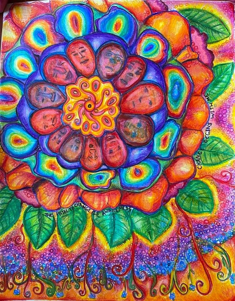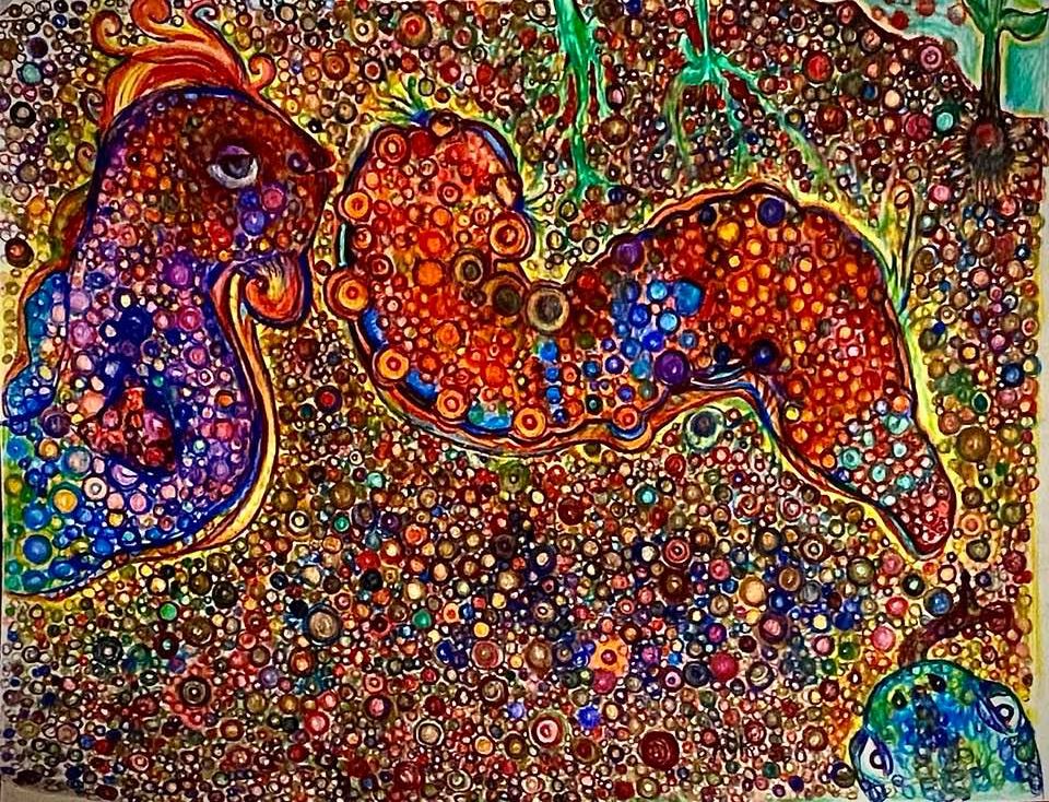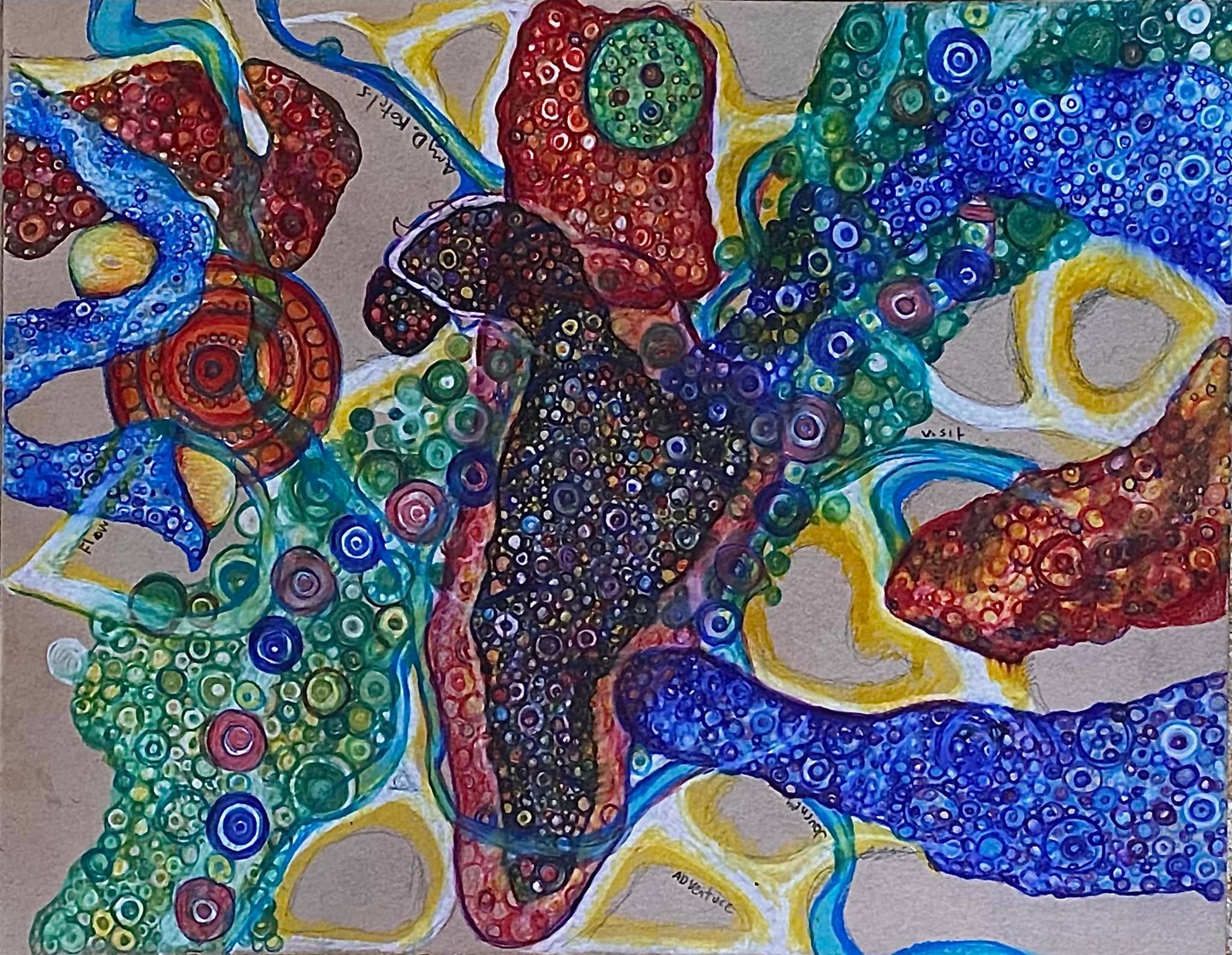 Above: What is Beyond, 11×14, Color Pencil, Watercolor Pencil, $185, Lip Abstract, 12×16,Color Pencil, Red, 8×11, Watercolor, Pencil, Collage, $45, Circle Abstract, 11×14, Color Pencil, $85