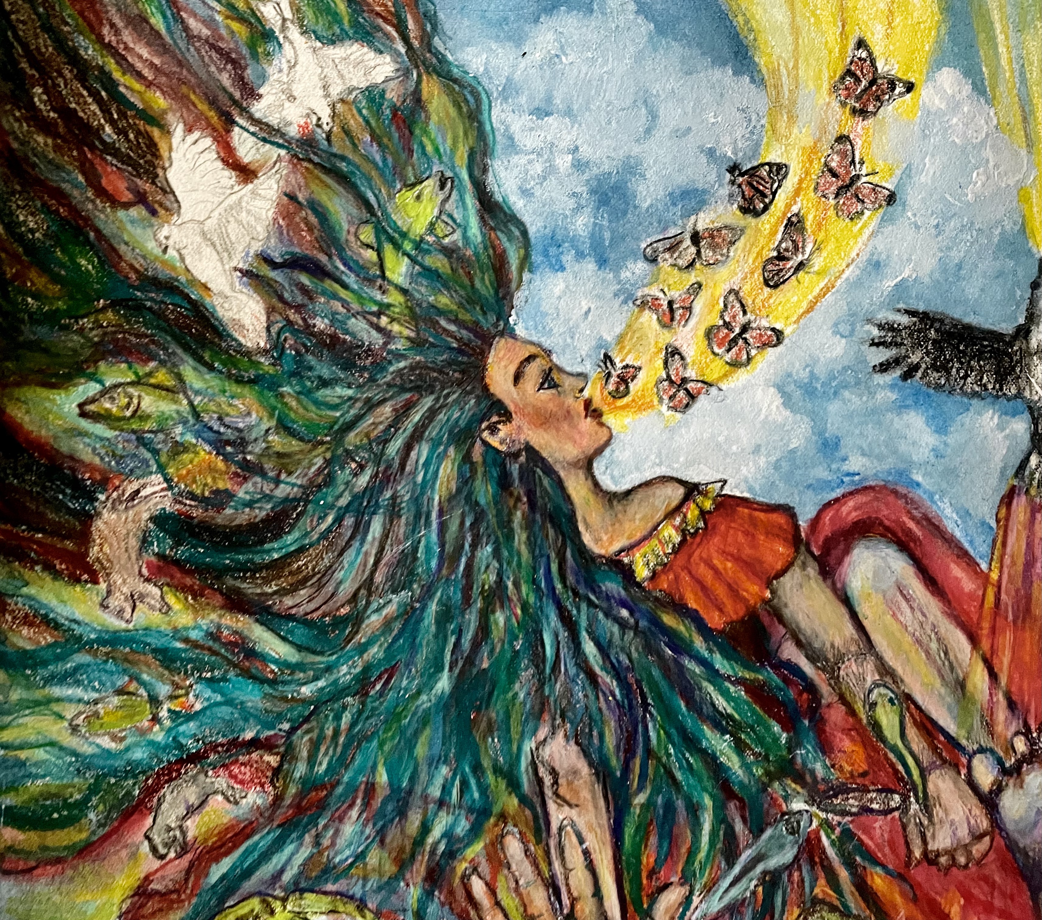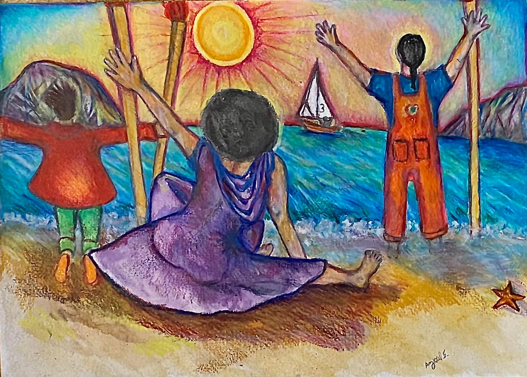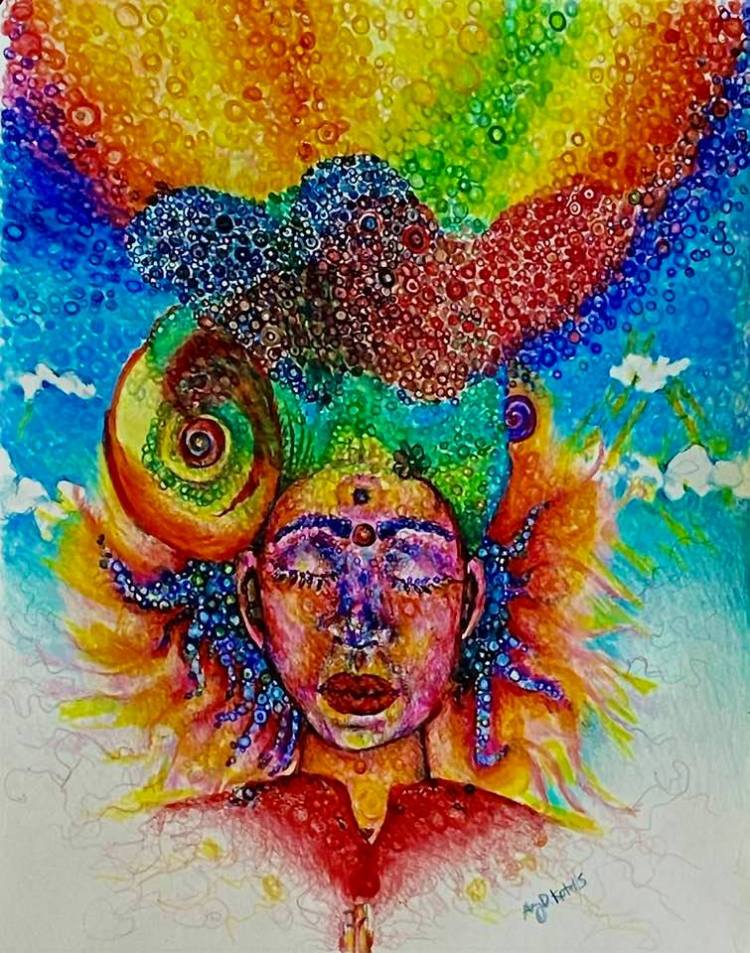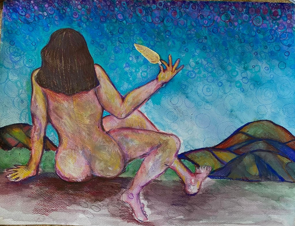 Below: Water Goddess, 11×14, Color Pencil, $225, Here Comes the Sun,9×12, Color Pencil, $95, Coy, 9×12, Watercolor, Color Pencil, $95, Lady With Feather, 11×16, Color Pencil, Watercolor Pencil, Collage, $195, Hey Sailors, 11×16, Color Pencil, Watercolor Pencil, $125