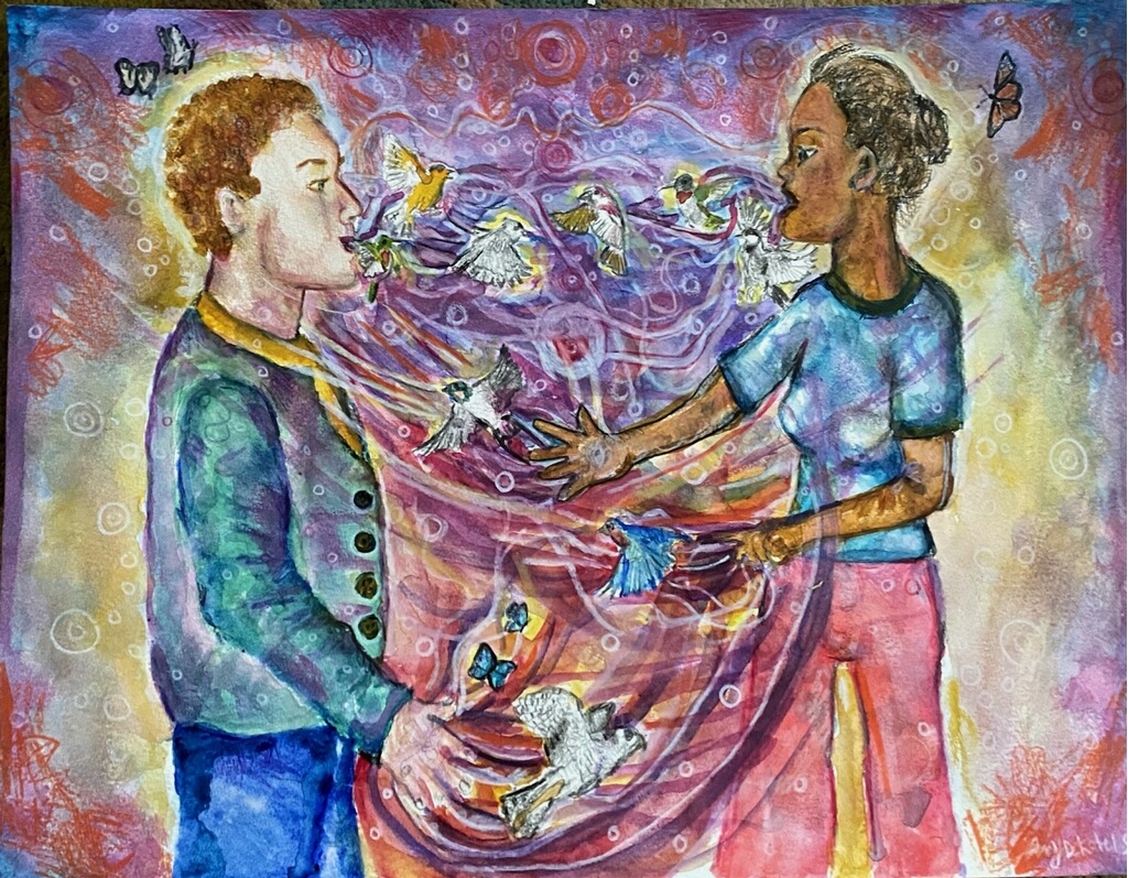 Bird Talk 12×16, Watercolor, Color Pencil, $245