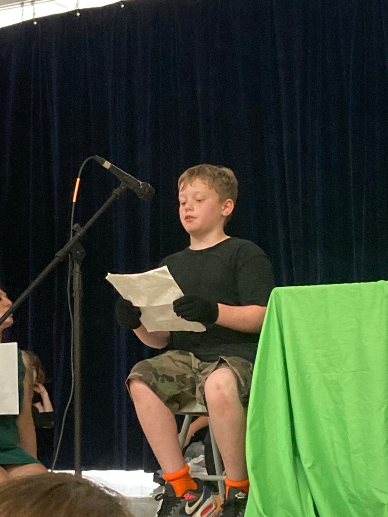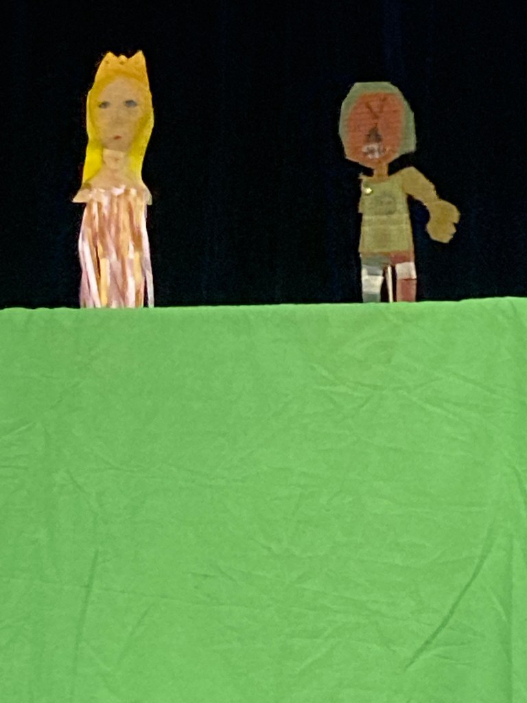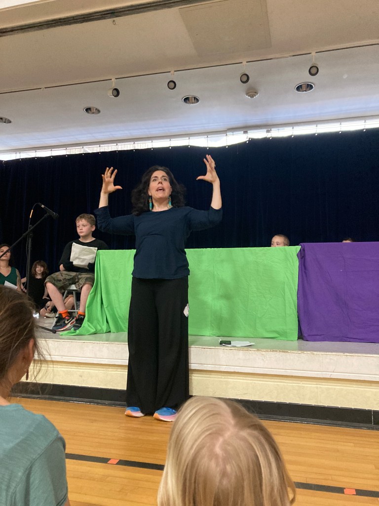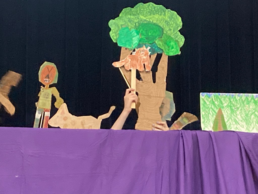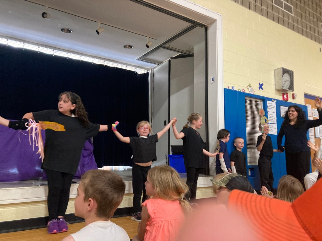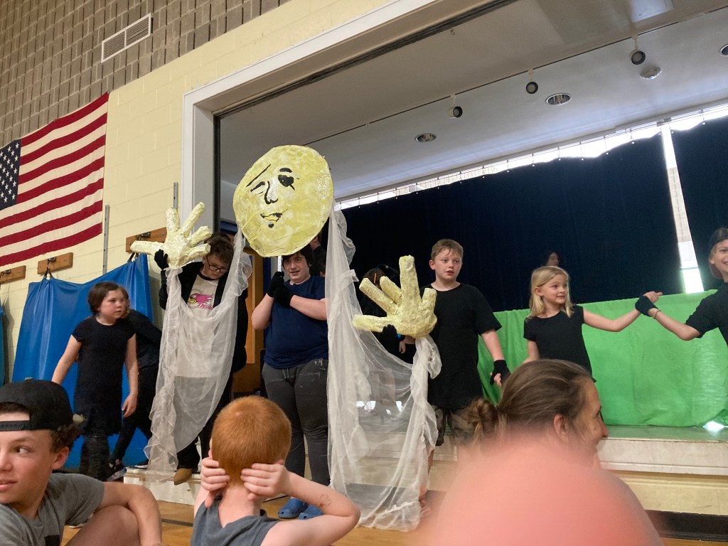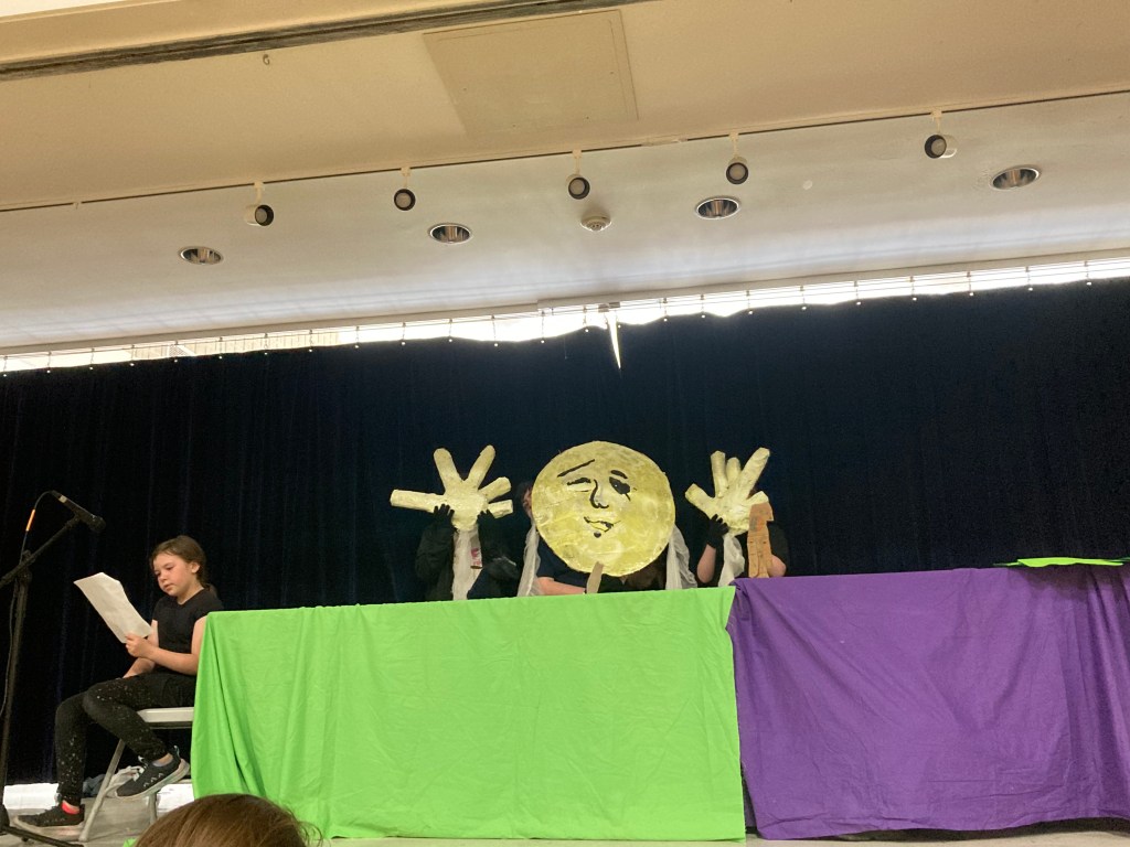I facilitated the Colrain Central Elementary School, 1-6 grade students to create a story, script, puppets, sets, and performance for their peers, their families, the school staff and community. Twenty one brave children performed on May 22, 2024 at the school. Collaborating with the music teacher and the librarian, before the performance we had a pagant parade, up and down the halls to alert the classes that the show was about to commence. Puppet participants help big and small puppets and students who are involved in the school music program played music to wake up the classrooms.